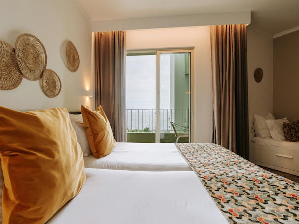 Este quarto duplo dispõe de uma varanda com vistas parciais para as montanhas e para o mar, uma televisão de ecrã plano, produtos de higiene pessoal gratuitos e um secador de cabelo.